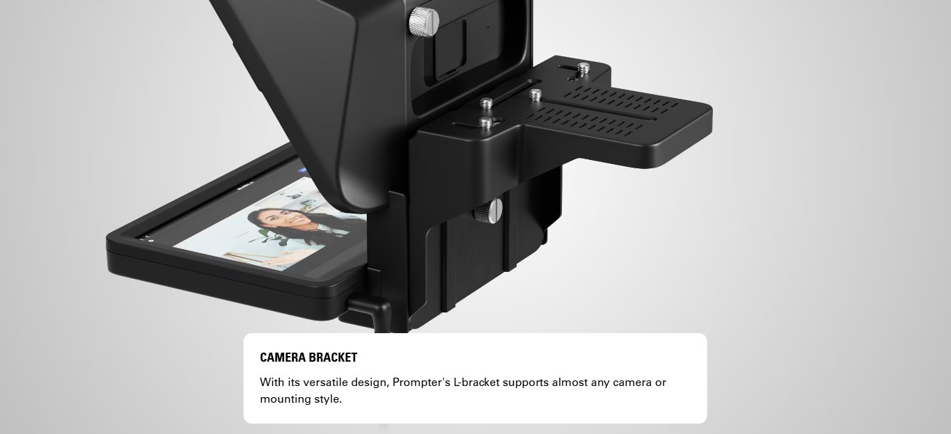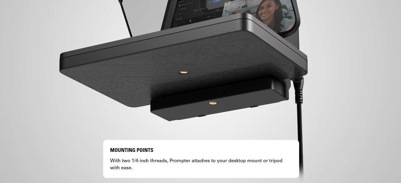 An all-in-one teleprompter should handle all kinds of cameras, not just DSLRs or mirrorless. That's why Prompter has multiple mounting options, supporting everything from webcams to smartphones.