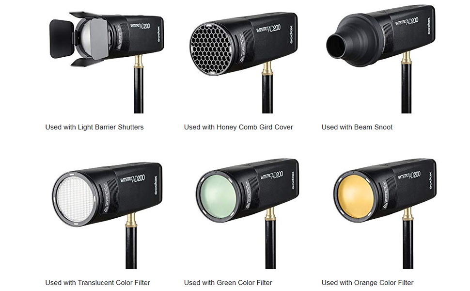 One of the AD200 Pocket Flash's interchangeable heads is the H200R Round Flash Head. Designed for it, this Godox AK-R1 Accessory Kit for H200R contains magnetically-attached modifiers that maximize the capabilities of the head. The kit contains a snoot, four-way barndoors, and a honeycomb grid to narrow the light's beam and selectively light your subject. Conversely, a near-180-degree dome, a wide lens, and a bounce card with a frame are provided to expand the beam. Finally, a filter set with three amber CT filters and one green fluorescent filter are also included.