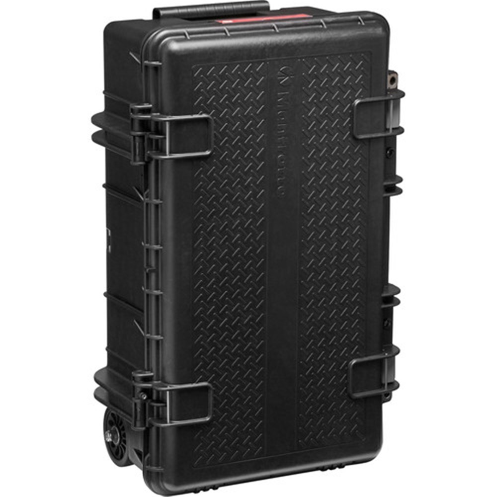 Store, transport, and protect two DSLRs, an attached select 70-200mm lens, three to four additional lenses, and related accessories in the black Pro Light Reloader Tough-55 Low Lid Carry-On Camera Rollerbag from Manfrotto. This lightweight case features an IP67 waterproof rating, padded touch-fastening dividers with lid foam, latch closure, and metal hasps for optional padlocks. Photographers will appreciate the included strap and pouch tripod holder system. Carry the case with the side handle or roll it with the retractable handle and built-in wheels.