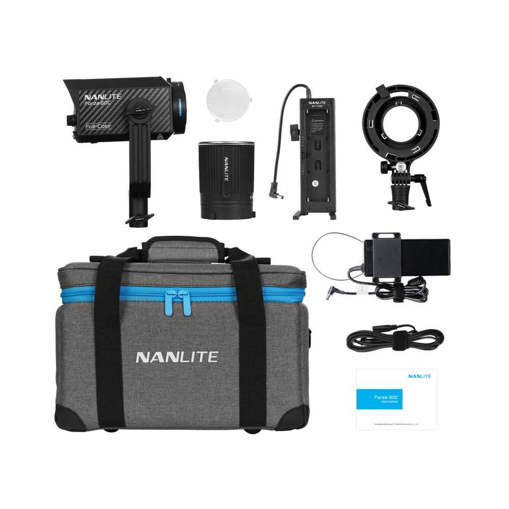 The Forza 60C RGBLAC LED Spot Monolight Kit from Nanlite features the lightweight and compact RGBLAC monolight-style LED light. It has a six-color mixing technology that incorporates lime, amber, and cyan LED chips, making it possible to produce highly accurate, daylight-balanced 5600K light. An ultrawide CCT range of 1800K-20,000K offers notably rich and saturated color output. It features 15 customizable color effects and can be controlled remotely with the NANLINK mobile app for iOS or Android. Its ultracompact form factor and vibrant color output make it an ideal lighting solution for every level of production, including professional films and television, independent films, documentaries, music videos, in-house content, and remote location work of all types.