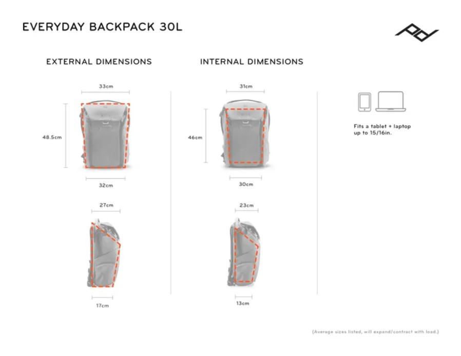 Inside, 3 configurable FlexFold dividers keep gear organized, protected, and not bunched at the bottom of your bag. Dedicated sleeves for up to 15” laptop (or 16" MacBook Pro), tablet, or documents, plus a variety of internal slip pockets for small items. 100% recycled 400D weatherproof shell keeps everything safe.