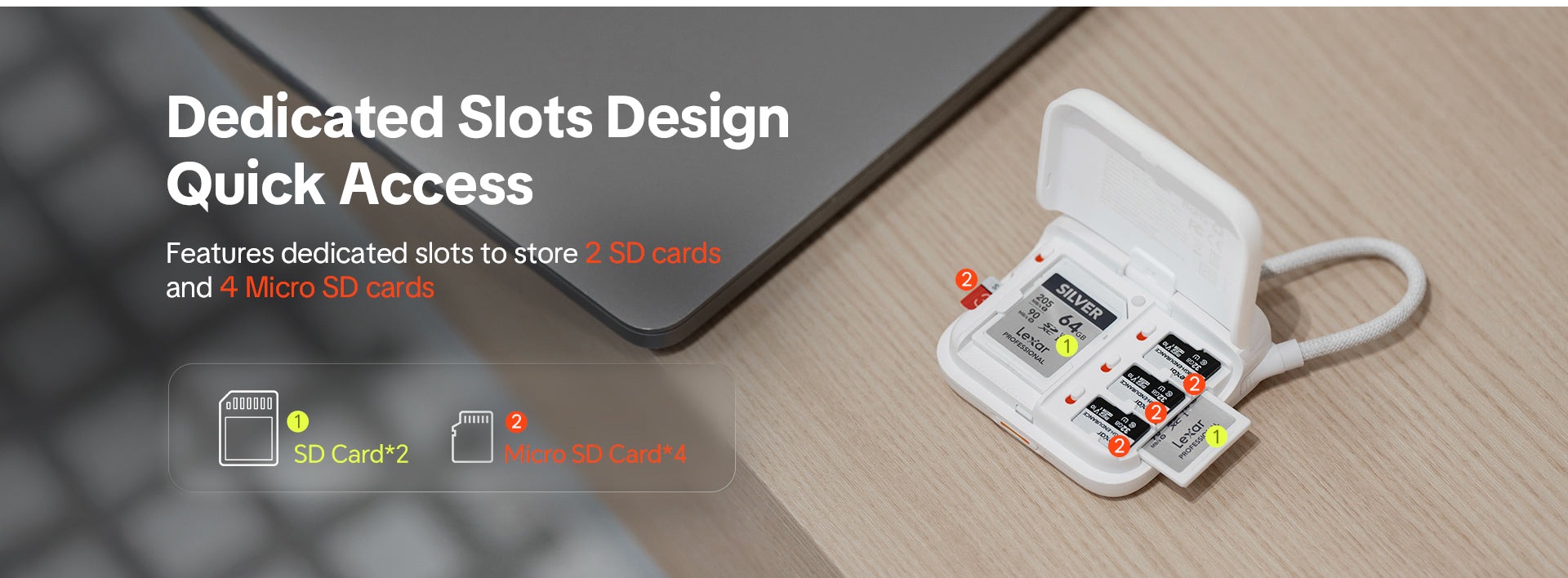 • Holds 2 SD cards + 4 Micro SD cards simultaneously